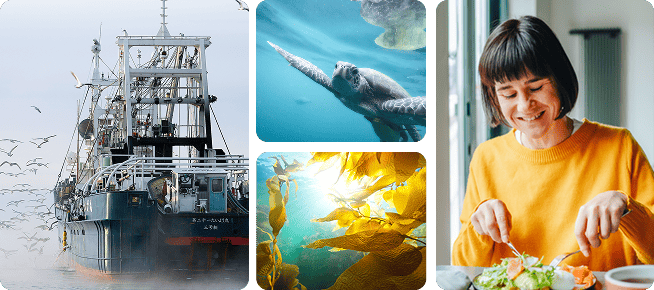 We are strengthening our use of internationally accredited programs and promoting sustainable wild-capture fisheries and responsible aquaculture. In particular, we are increasing our handling of seafood certified by GSSI-recognized programs*, with a goal of ensuring that more than 15% of total sales across all products—including seafood and seafood-derived items—come from certified sources by 2030.