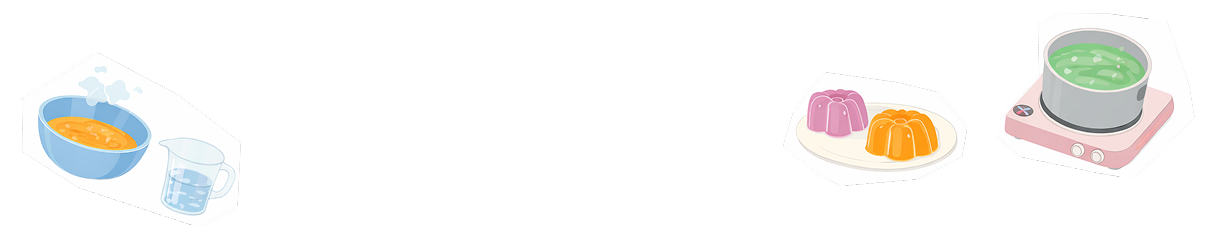 牛と豚由来のコラーゲンから作られる、ぷるぷるとした食感が特徴の素材です。50~60℃のお湯に振り入れるだけで簡単に溶け、10~15℃以下で固まります。