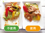 おいしくできた野菜の炒め物も、時間が経つと水分が出てきてべちゃべちゃに…そんなときはかんてんクックをふりかけると、水分が流れ出るのを防ぎます。