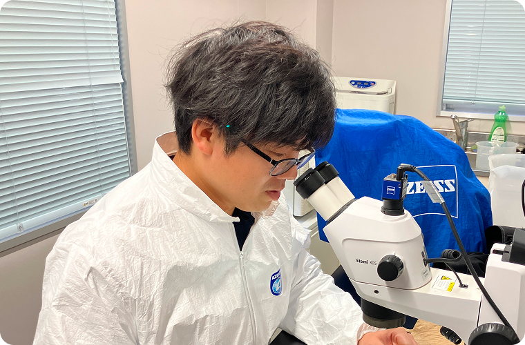 現在は、陸上施設でブリの人工種苗の管理、育成を主な業務として行い、それに付随する様々な課題を解決するべく技術開発を行っています。
