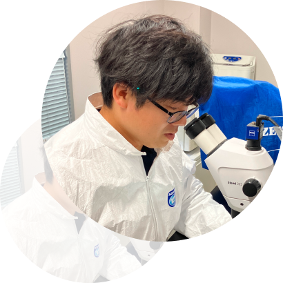 現在は、陸上施設でブリの人工種苗の管理、育成を主な業務として行い、それに付随する様々な課題を解決するべく技術開発を行っています。時には、海上作業にも従事し、陸上施設と海上施設の両方向で課題を検討し、適切でクリエイティブな技術開発ができるよう心がけています。また、自分は手先が器用な方で、網の作成や修理など細やかな業務を任されることがあり、とてもやりがいを感じています。
