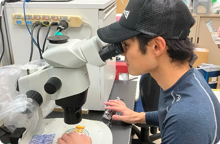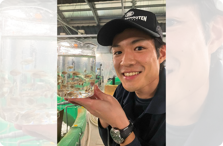 完全養殖魚の技術開発に携わることで未来の魚食を支える力になりたいと考え、技術力と実績ある弊社で学びたいと思い入社しました。幼少期から生き物と魚を食べることが好きだったため大学から水産の道へ進みました。水産業を詳しく学ぶ中で、サステナブルな水産資源の利用のため、天然資源に依存しない完全養殖魚に魅力を感じていました。
