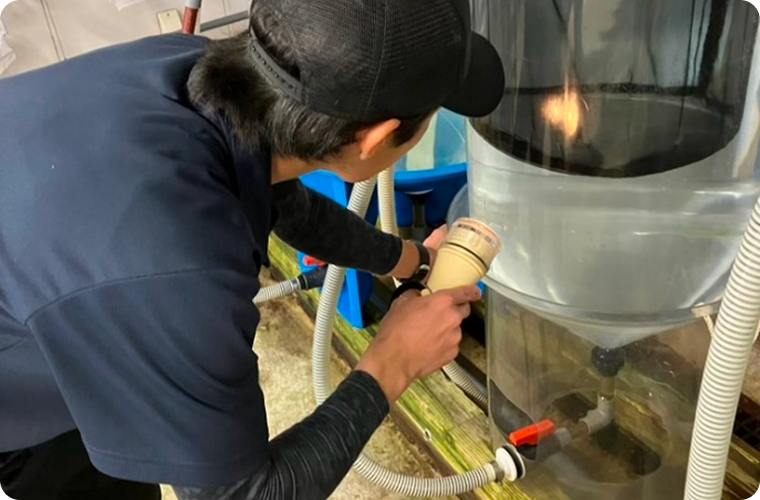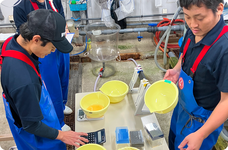 課題や困難に直面したとき、中央研究所などと協力して意見を出し合いながら検証や試験に挑み、成果や新たな知見が得られたときにとてもやりがいを感じます。生き物中心の仕事であるため生産期間は緊張感のある忙しい日々となりますが、生産の最前線で働きながら、多くの人の力と培われてきた経験が結集し、稚魚が成長していくのを見られることが魅力です。