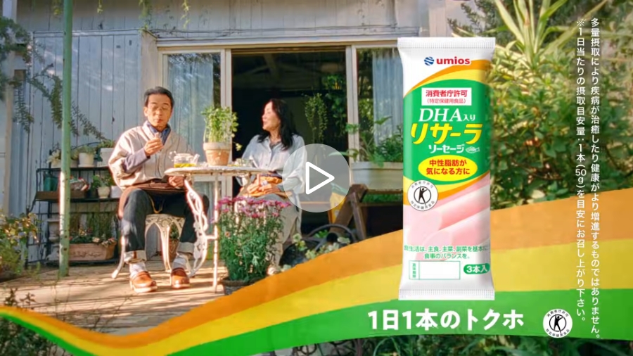 Umiosフィッシュソーセージ「DHA入りリサーラソーセージω(オメガ)」TV-CM”どっちのリサーラ?赤のリサーラ”篇(15秒) -