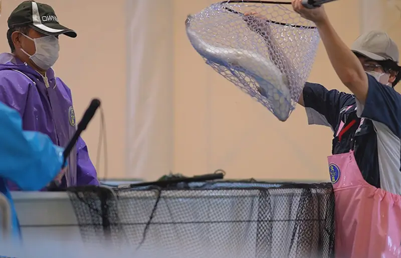 人の姿を見せずにどう給餌すればいいのか。あれこれ試してみるもののお手上げ状態。山形県に試験用種苗専用の水槽を用意してくれるように頼み込み、人に慣れるまで毎日、種苗生産施設まで餌やりに通うことになりました。結果「人は餌をくれる存在」と覚えた稚魚は餌をよく食べ、大きく成長してくれました。魚体の大きな魚を親魚に選抜し、さらにより成長が早い魚、より体型の良い魚と選抜育種を繰り返し、4年に及んだプロジェクトで4回の種苗生産試験を実施し、平均体重2kgまで成長させることに成功しました。