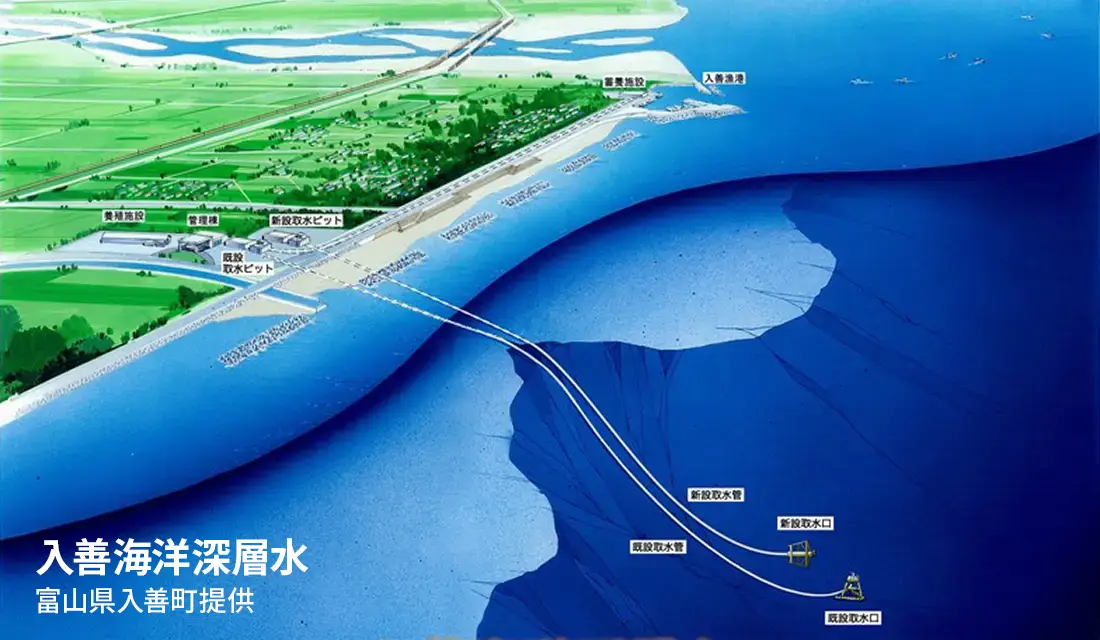 入善町の沖合3キロメートル、水深384メートルから低温の海洋深層水(日本海固有水)を取水。夏場の水温維持にかかる光熱費抑制が期待されている。