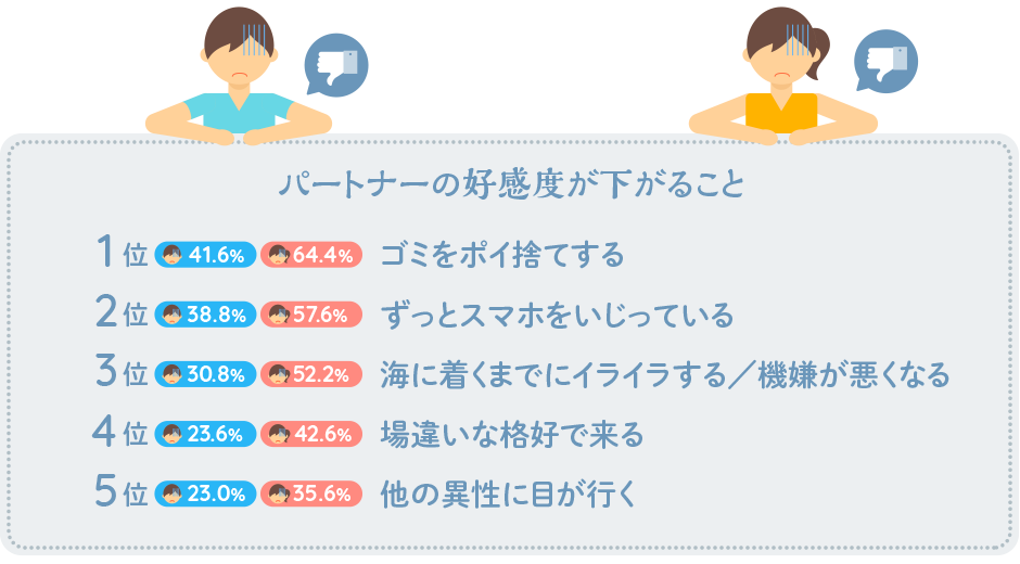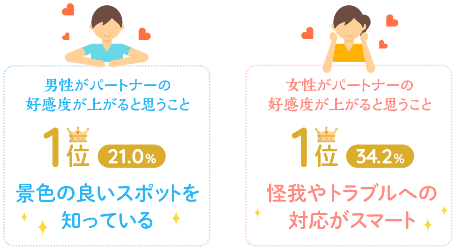 男女共通して好感度がアップするポイントになっているのは「絶景ポイントを知っている(男性21.0%)(女性32.4%)」「ケガやトラブルへの対応がスマート(男性16.6%)(女性34.2%)」「持ち物の用意が万全(男性20.0%)(女性25.8%)」でした。