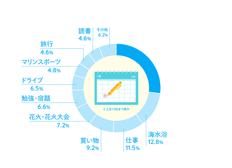 これまでの海の日の過ごし方を聞いたところ、「家にいる」が27.0%で最も多くなり、次いで「海水浴」が12.8%、「仕事」が11.5%となりました。海の日を家でゆっくり過ごしている人が多いようです。また、高校生や大学生にとっては夏休み期間中ということもあり、10代では「勉強・宿題」が20.5%で、「家にいる(33.5%)」に次いで高くなりました。