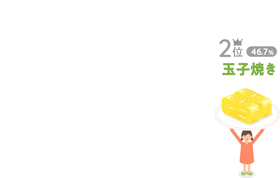 お弁当のおかずによく入れるものを聞いたところ、1位「玉子焼き」(71.8%)2位「鶏のからあげ」(58.7%)3位「ウインナー」(58.5%)4位「ハンバーグ」(42.6%)5位「ミートボール」(34.4%)となりました。1位の「玉子焼き」は7割以上の人が回答しており、お弁当のおかずの定番といえそうです。「玉子焼き」は、自身が食べたいおかずとお弁当の節約メニューには欠かせないおかずでも1位に挙がっており、3冠を達成しました。
