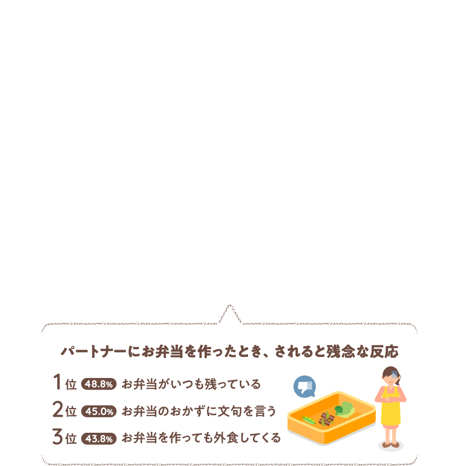 また、最近では、お弁当を自分で作る弁当男子が増えてきているといわれていますが、もし夫や彼氏が自分よりおいしい弁当を作ってくれたとしたらどのように感じるのでしょうか。結果は『うれしい(計)』が80.3%、『うれしくない(計)』が19.7%となりました。夫や彼氏が自分よりもおいしいお弁当を作ってくれたら、純粋にうれしいという人が多いようです。