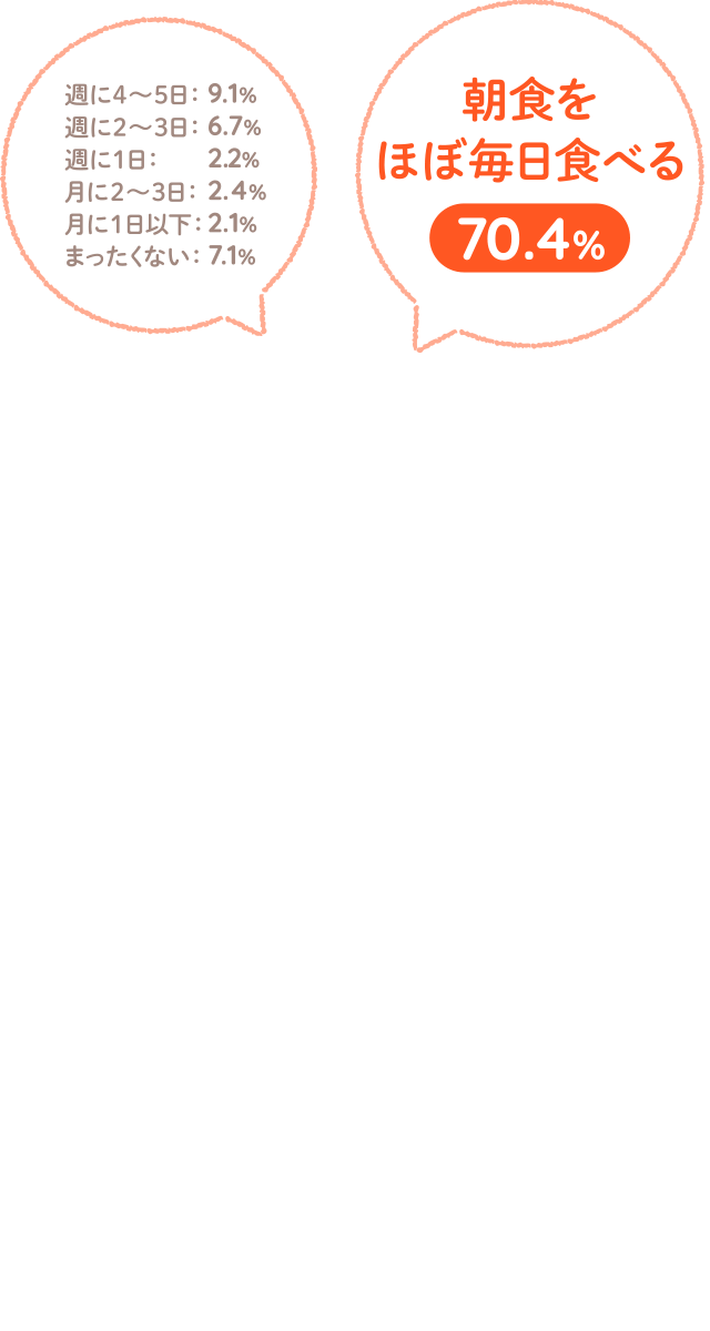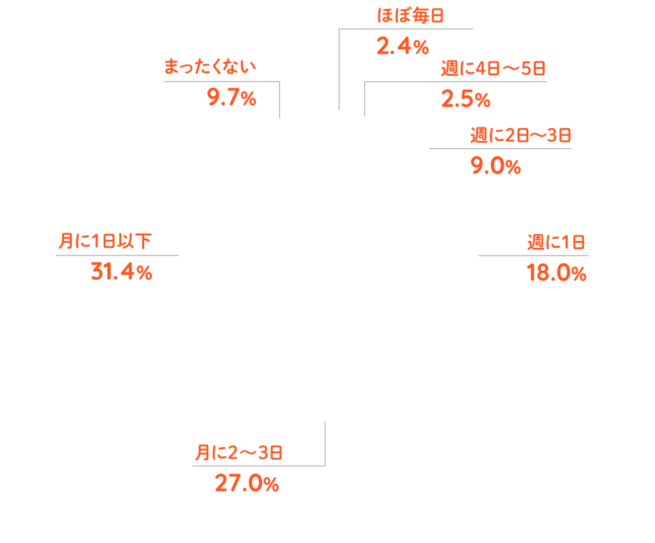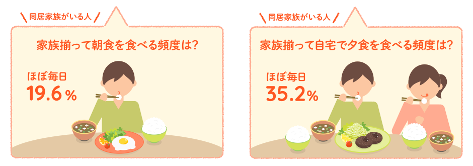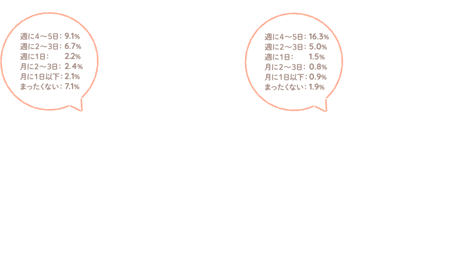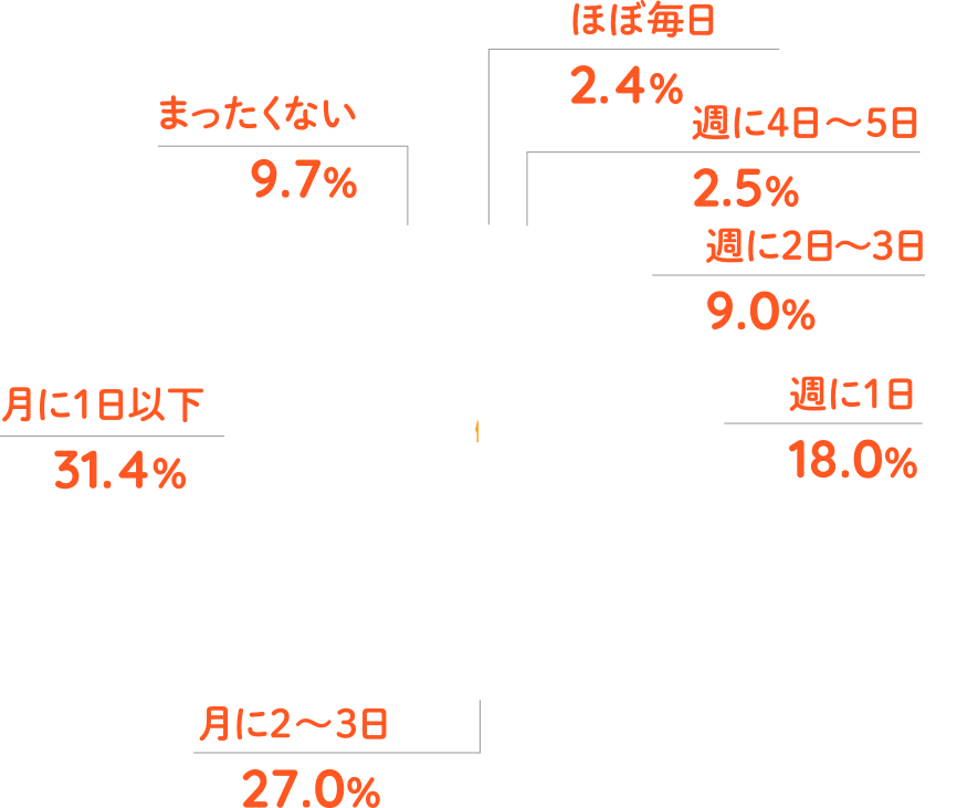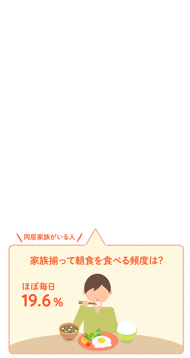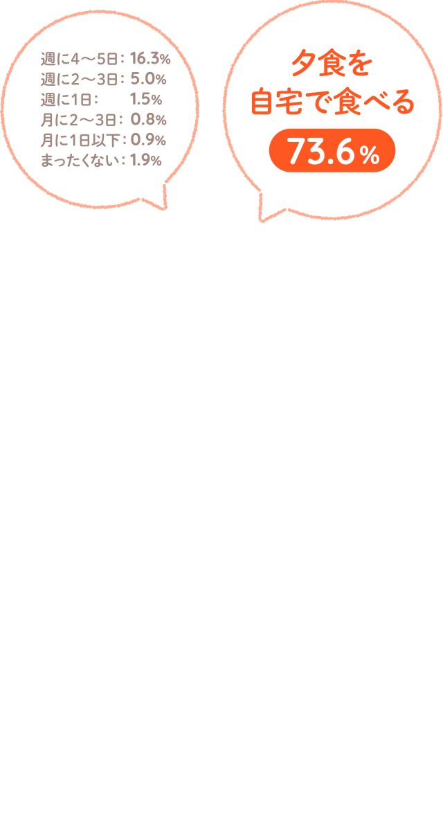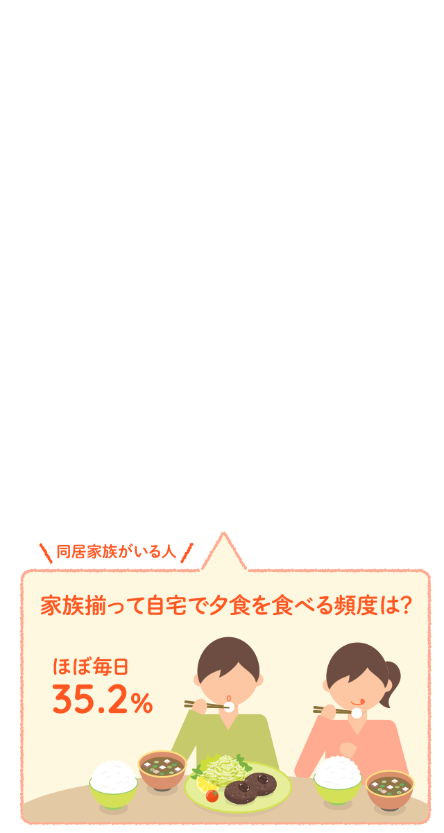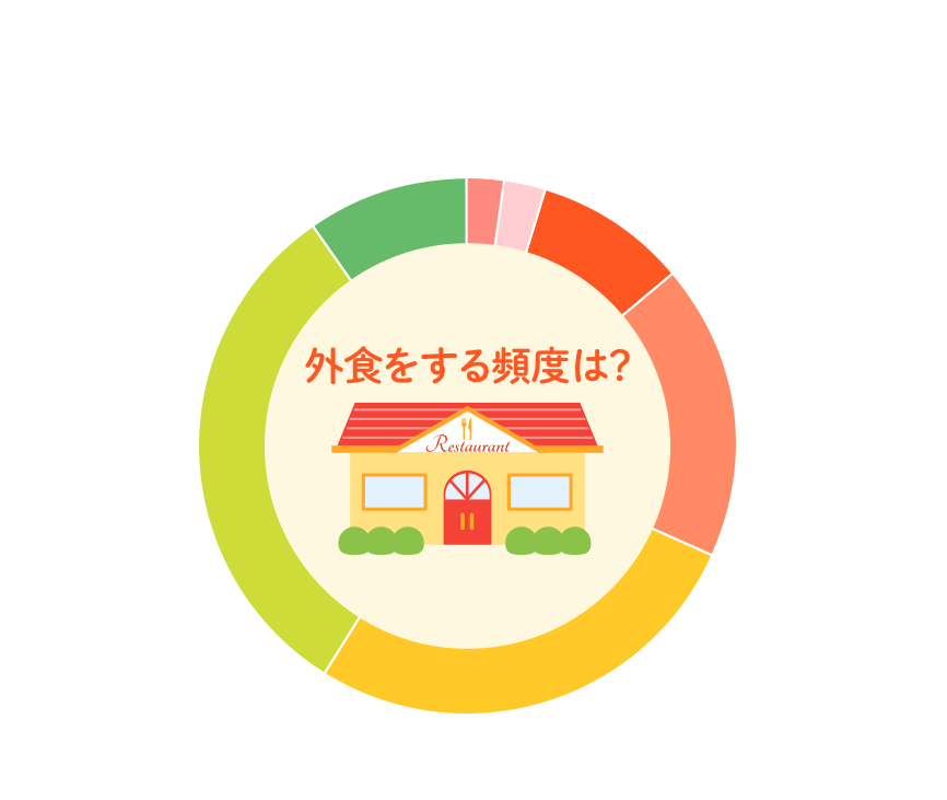 食生活に関する昨年からの変化を聞いたところ、≪朝食を食べる頻度≫では、朝食を食べる頻度が増えた人が約7割となりました。≪家族揃って朝食を食べる頻度≫では、減った人が約6割となりました。≪自宅で夕食を食べる頻度≫では、約7割が増えたと回答しました。≪家族揃って自宅で夕食を食べる頻度≫では、『増えた(計)』は54.4%、『減った(計)』は45.6% となりました。≪外食をする頻度≫では、『増えた(計)』は38.4%、『減った(計)』は61.6%となりました。外食の頻度は減少傾向のようです。