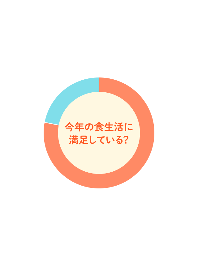 今年の自身の食生活に満足しているか聞いたところ、『満足(計)』(「とても満足」「どちらかといえば満足」の合計、以下同じ)は78.2%、『不満』(計)』(「とても不満」「どちらかといえば不満」の合計、以下同じ)は21.8%となりました。大半の人が、今年の食生活に満足しているようです。世代別にみると、『満足(計)』は10 代(85.5%)が最も高く、40 代(72.5%)が最も低くなりました。地域別にみると、今年の食事に満足している人の割合が最も高かったのは北陸・甲信越(85.0%)でした。