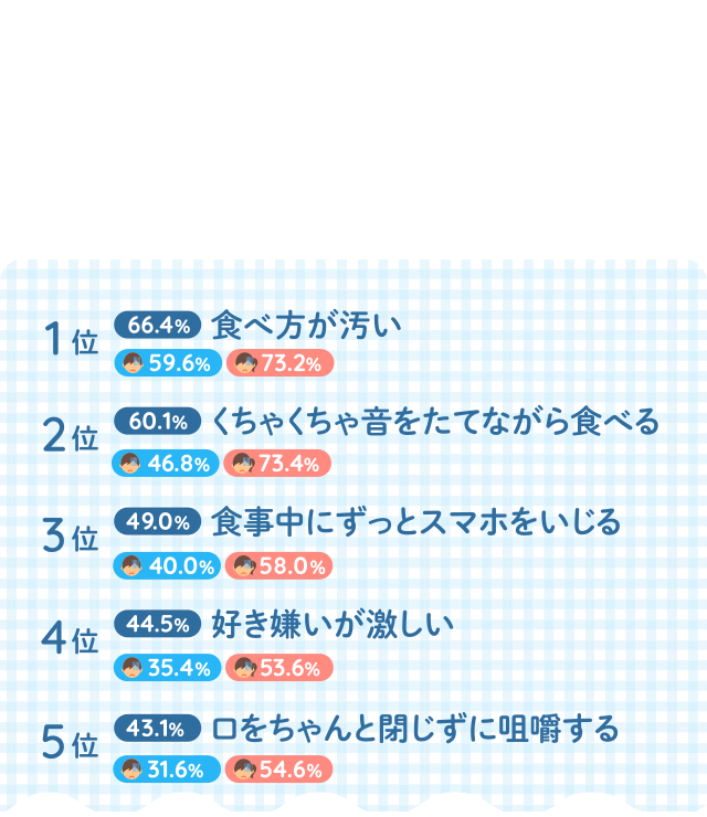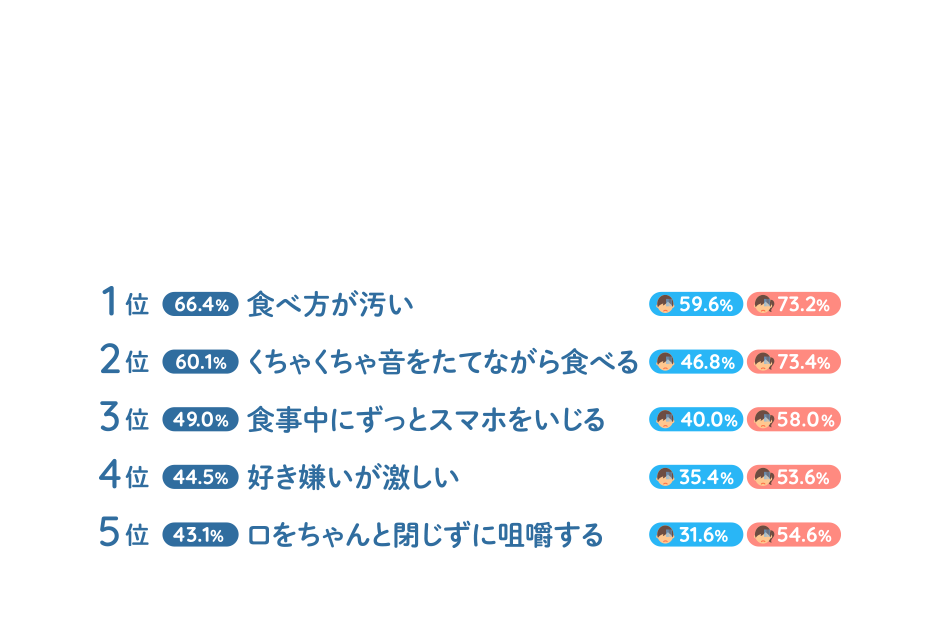 男女別にみると、「くちゃくちゃ音をたてながら食べる」(男性46.8%、女性73.4%)や「口をちゃんと閉じずに咀嚼する(噛む)」(男性31.6%、女性54.6%)、「おいしいものを食べてもリアクションがない」(男性23.4%、女性47.4%)では女性のほうが20 ポイント以上高くなりました。マナーの悪い食べ方をしていたり、せっかくおいしい食事をしていてもノーリアクションだったりするような相手にガッカリという人は女性に多いようです。