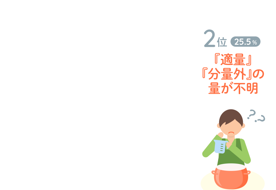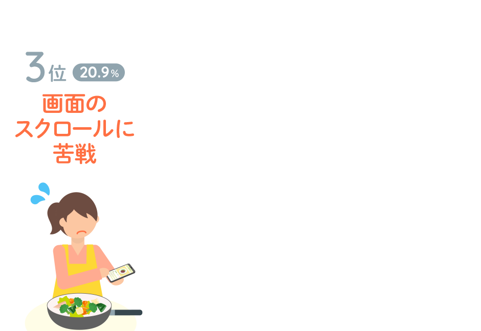 男女別にみると、男性回答では「『適量』『分量外』がどのくらいかわからなかった」(1位、28.7%)や「火加減がわからなかった」(4位、18.1%)、「『だし汁』がどのくらいの濃さがいいのかわからなかった」(5 位、15.3%)などが上位に挙がりました。男性には、感覚が求められるようなときに困った経験をした人が多いようです。 他方、女性回答では「料理中にスクロールしづらかった(スマホ・タブレットなど)」(2 位、26.6%)や「スマホ・タブレットが食材で汚れてしまった」(4位、19.2%)など、スマホやタブレットに関する回答が上位に挙がりました。