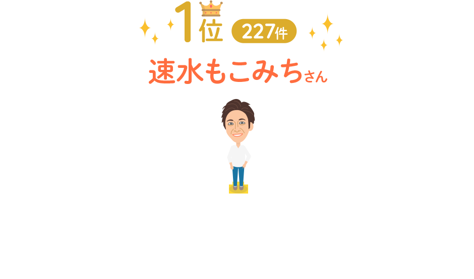 料理を教えてほしい男性 芸能人を聞いたところ、「速水もこみちさん」(227件)がダントツ、2位「馬場裕之さん」(33件)、3位「タモリさん」(28件)、4位「木村拓哉さん」(22件)、5位「梅沢富美男さん」(11件)となりました。他方、料理を教えてほしい女性芸能人を聞いたところ、1位「ギャル曽根さん」(40件)、 2位「新垣結衣さん」(24件)、3位「小倉優子さん」「北斗晶さん」(いずれも20 件)、5位「綾瀬はるかさん」(19件)となりました。