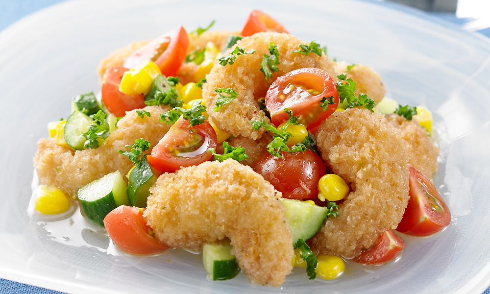 【油で揚げる専用】えびフライ(Umios) 10尾 揚げ油 適量 または 【電子レンジ調理専用】えびフライ(Umios) 10尾 A 酢 大さじ1 はちみつ 小さじ1 塩 小さじ1/4 こしょう(黒) 少々 オリーブオイル 小さじ1 パセリ(みじん切り) 少々 ミニトマト(1/4にカット) 4個 きゅうり(角切り) 1/3本 コーン 大さじ1