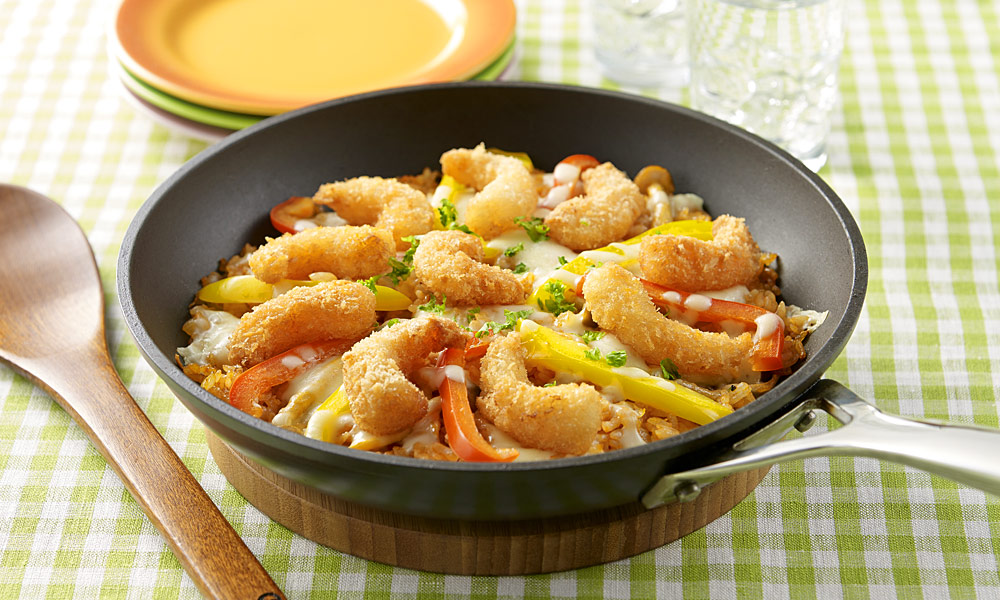 または 【電子レンジ調理専用】えびフライを温める2 フライパンにバターを熱し、にんにくを炒める 3 たまねぎ、しめじを加え、さらに炒める 4 ごはんを入れてコンソメ、ケチャップを加える 5 1、パプリカ、トマト、チーズをのせる 6 ふたをしてチーズが溶けたら、パセリを散らす