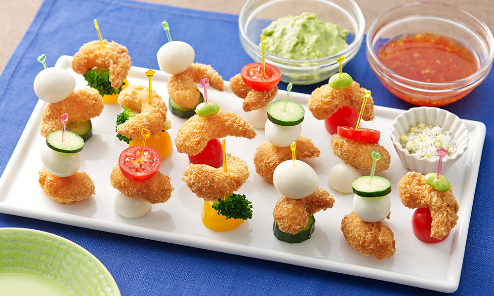 または 【電子レンジ調理専用】えびフライを温める2 お好みの具材をピンチョスにさす 3 ディップソースを準備する 4 お好みのディップにつけていただく