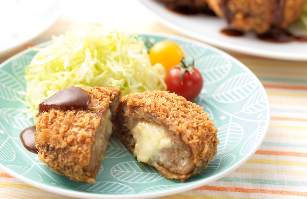 ワンポイントアドバイス- 衣をつける前にハンバーグについているデミグラスソースは取り除きメンチカツのソースに。