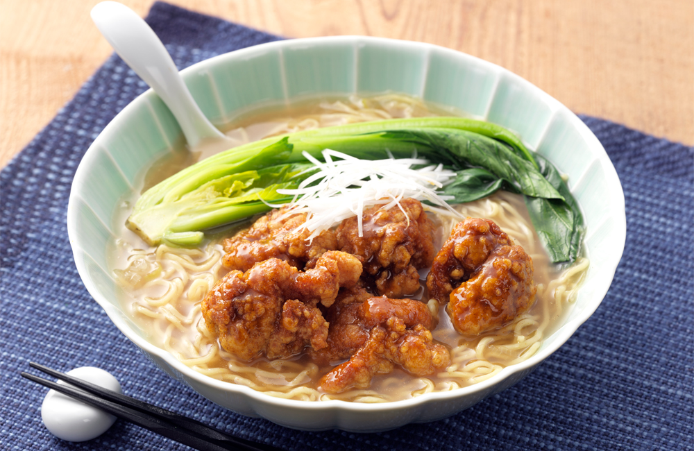 またはめっちゃうまいからあげを温める2 パーコータレの材料を合わせて、1に和える 3 麺を茹でる 4 Aを温め、青梗菜を加える 5 器に2、3、4 を盛りつけ、白髪ねぎをのせ、こしょうをふる