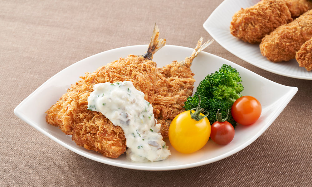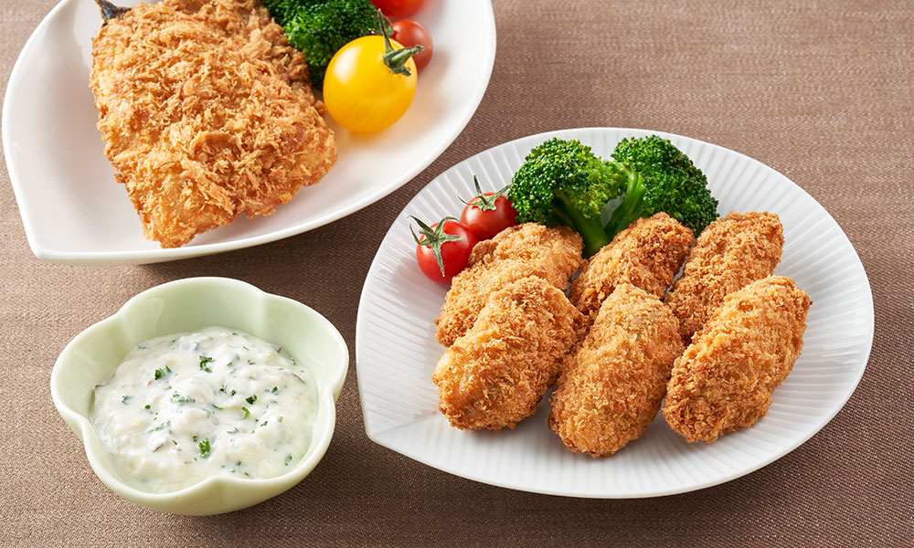 または【電子レンジ調理専用】あじフライを温める2 かきフライを揚げる 3 しめじに小麦粉をまぶし、耐熱容器でラップをかけて電子レンジで600W1分程度加熱する 4 3にバターを加え30秒加熱したら、牛乳を加え混ぜ、さらに1分加熱する 5 4、Aを和え、1、2にかけていただく