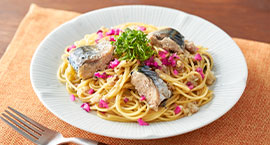 さば水煮缶と柴漬けのガーリックパスタ