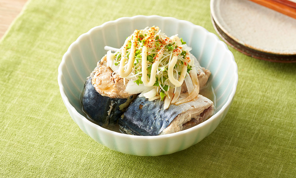 1 さば水煮を器に盛りつける 2 たまねぎ、ブロッコリースプラウトを盛り、マヨネーズ、七味唐辛子、ポン酢をかける