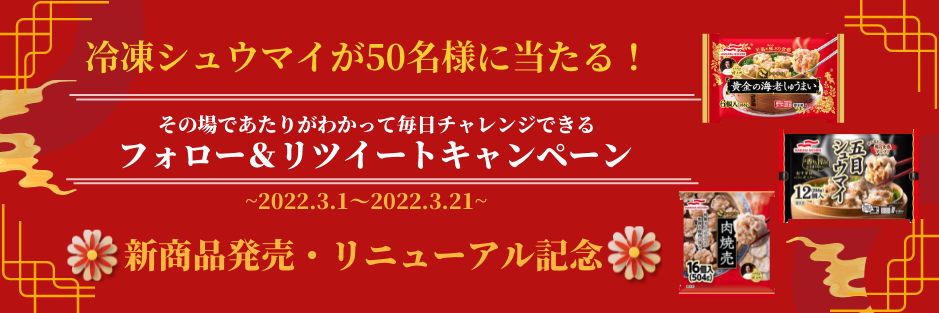 - 「マルハニチロ冷凍食品『新中華街®』シリーズ シュウマイが50名様に当たる!Twitterキャンペーン」