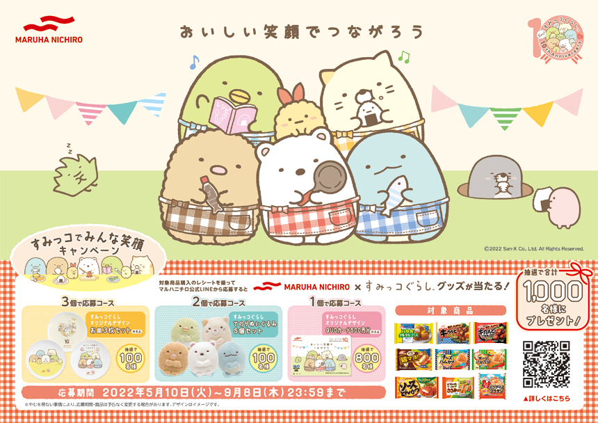 マルハニチロ株式会社(本社所在地:東京都江東区、代表取締役社長:池見 賢)は、冷凍食品9品を対象に、合計1,000名様に人気キャラクター「すみっコぐらし」のグッズが当たる『すみっコでみんな笑顔キャンペーン』を2022年5月10日(火)より開始いたします。