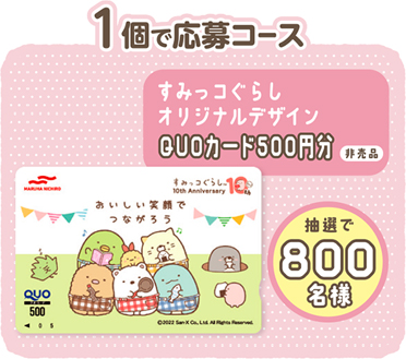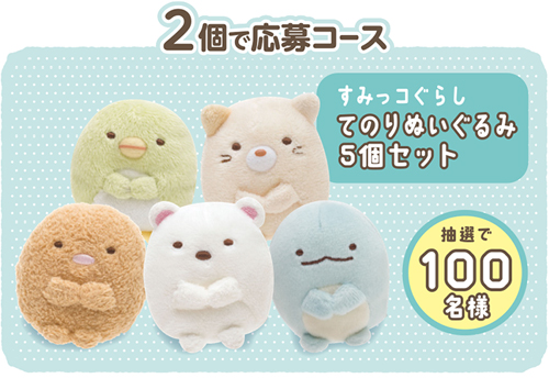 本キャンペーンは、対象商品の中からご希望のコースに必要な個数をお買い上げいただき、レシートを撮影し、LINEからご応募いただけます。応募いただいた方の中から、抽選で100名様に『すみっコぐらし オリジナルお皿』、100名様に『すみっコぐらし てのりぬいぐるみ5個セット』、800名様に『すみっコぐらし オリジナルQUOカード500円分』をプレゼントいたします。