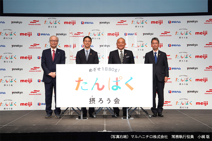 6月17日に、「渋谷ヒカリエ ヒカリエホール」において行われた、『めざせ1日80g!たんぱく摂ろう会』設立記念発表会では、幹事会社であるマルハニチロ株式会社の常務執行役員 小梶 聡、伊藤ハム米久ホールディングス株式会社の常務執行役員加工食品事業本部長 伊藤 功一よりご挨拶を行ったのち、代表幹事会社である株式会社 明治 代表取締役社長 松田克也より、本コンソーシアムが目指すゴールや今後の具体的な取り組みについて発表しました。また、公益社団法人 日本栄養士会 代表理事会長の中村丁次様より、現代の栄養課題として「栄養不良の二重負荷」についての解説と栄養課題解決のためのたんぱく質の重要性についてご紹介いただきました。