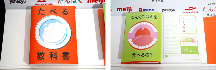 加えて、『めざせ1日80g!たんぱく摂ろう会』のプロジェクト第一弾である食育コンテンツ『たべる教科書』のお披露目も行いました。『たべる教科書』は公益社団法人 日本栄養士会監修のもと作成した、小学校の中・高学年を対象にたんぱく質の大切さを学び、実際に食べることで理解を深めることができる、たんぱく質にまつわる「体験学習型の教科書」です。