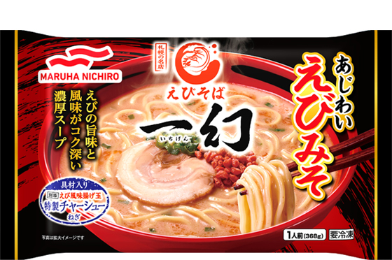 水産素材にこだわる北海道の有名ラーメン店「えびそば一幻」と水産に強みを持つマルハニチロがコラボし、エビの旨みと風味が凝縮されたお店の人気ナンバーワンメニュー「あじわいえびみそ」を冷凍食品で再現しました。ご家庭で簡単にご当地ラーメンの味をお楽しみいただけます。