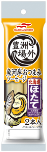 - 「豊洲場外 魚河岸おつまみソーセージ 北海道ほたて」は、北海道産のホタテを配合した、ホタテ本来の旨味や香りを詰め込んだフィッシュソーセージです。
