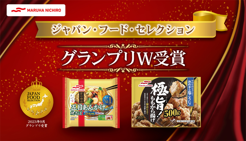 マルハニチロ株式会社(本社:東京都江東区、代表取締役社長:池見 賢)は、2023年9月、一般社団法人日本フードアナリスト協会が主催する「第67回ジャパン・フード・セレクション」において、冷凍食品「五目あんかけ焼そば」「極旨!ももから揚げ」の2品が最高評価である「グランプリ」を受賞しました。