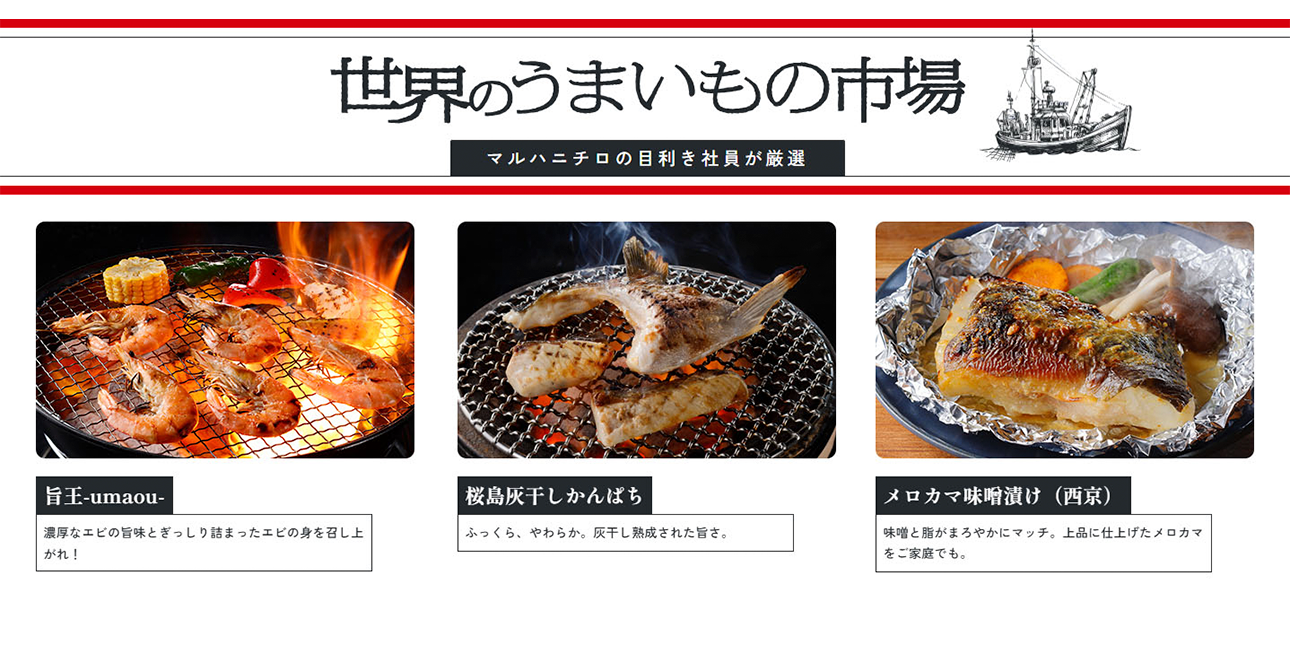 上質な水産素材品を中心に、マルハニチロの目利き社員が厳選した商品をお届けします。当社ブランドの商品や、資源アクセス力を生かした希少素材など、本当におすすめしたい商品を、驚きと発見に満ちた食材のストーリーとともに展開します。