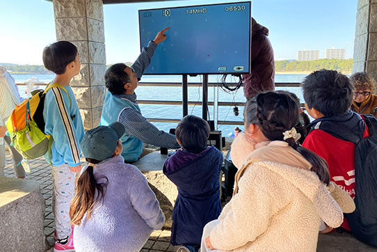 ▲海中に播種パックを埋める様子を見学