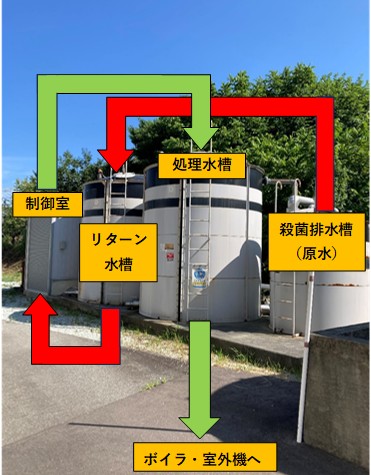 当社グループの一部の生産拠点において、水利用の循環を促進するため、工程排水の回収・再生処理技術を活用し、水の再利用を行っており、取水依存度の低減と生産活動における取水効率の向上を図っています。Umios山形株式会社では、製造の殺菌工程での排水をUF膜で処理し、ボイラーへの給水への使用や、夏場に空調機、冷凍冷蔵庫などの室外機へ散布することで、上水の削減を行っております。さらに年間通して処理水の温度が35~45℃であるため、重油の削減にもつながっています。
