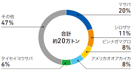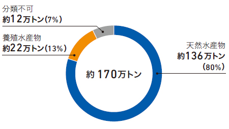 当社グループ全体の2021年度の取扱実績は、原魚換算で約170万トンとなり、前回調査結果の176万トンに対して6万トンの減少となりました。これは2021年の世界の漁業・養殖水産物生産量の約0.8%に相当し、取扱魚種は学名で天然魚337種、養殖魚83種におよびました。一方、分類不可は飼料原料由来を中心に約12万トンとなり、前回調査時の14万トンから改善はされたものの、依然大きな課題と認識しています。
