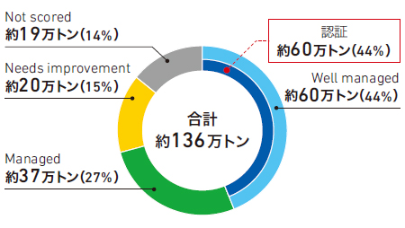 一方で、15%にあたる約20万トンが「Needs improvement(改善を要する)」、14%にあたる約19万トンがデータ不足のため「Not scored(評価不可)」と評価され、改善が必要な課題と認識しています。