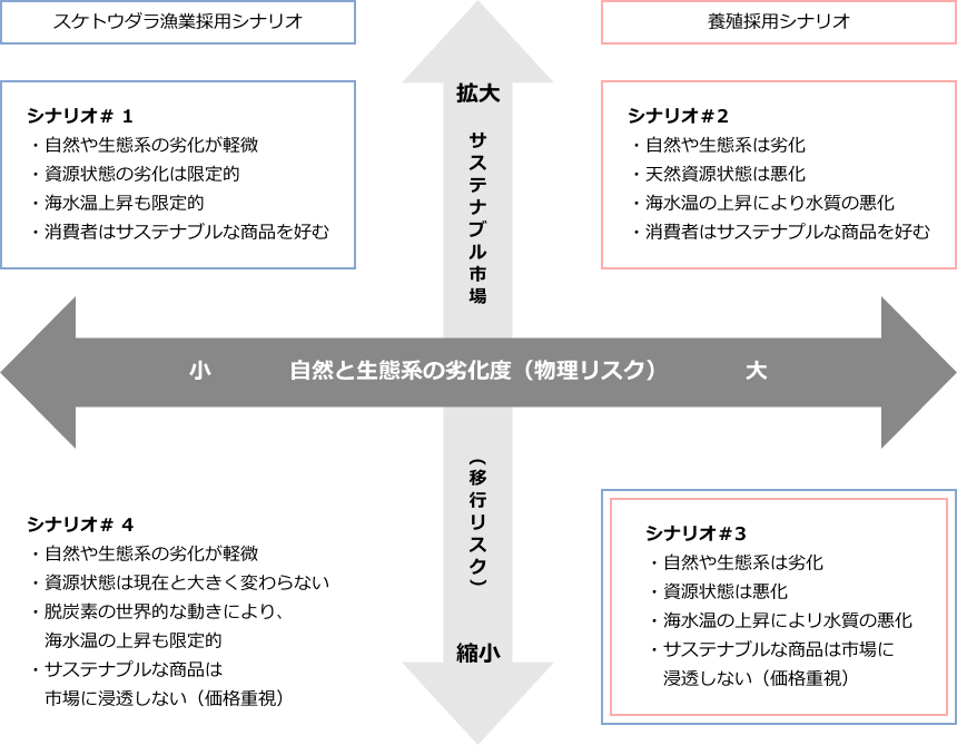 | スケソウダラ漁業 | 影響 | 海洋生態系の生息環境 | 移行リスク | 政策 | 1 | 1 | Low | 乱獲は強く規制されており、環境影響も天然水産物に影響を与えるほどではない。資源量および漁獲量は維持される。 | 4 | 3 | High | 海水温の上昇など外部的な影響で、資源量および漁獲量は著しく減少する。 |