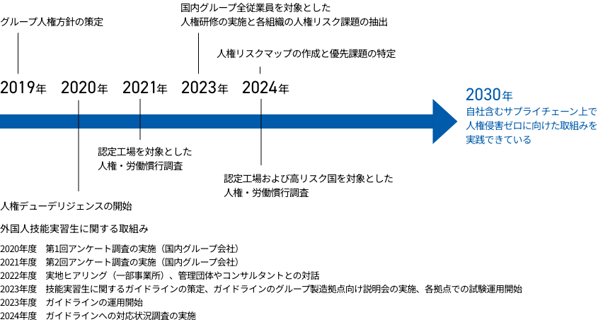 当社グループが事業活動を行っていくためには、強制労働・児童労働の禁止といった人権、労働慣行への配慮および、社会的責任、環境に配慮した持続可能なサプライチェーンの構築が必要不可欠です。2019年度より、人権デューデリジェンスの仕組みの構築に向けた取組みを本格化し、国内外の事業活動を通じた人権リスクの洗い出しと現状把握を進めています。また、グループ従業員に向けた人権研修においても、国際基準の人権尊重の認知に努めています。