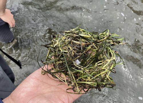 コアマモは、アマモ等の海草とともにアマモ場を形成し、イカや魚が卵を産みつけたり、小さな魚のすみかになったり、海の生き物にとって大切な「海のゆりかご」です。アマモに比べて下部密度が極めて高く、草体に占める地下部の割合が高いため、底質を安定させるはたらきがあり、干潟の維持や干潟から浅場にかけての生物の保全、連続的な生態系に重要な役割を果たしています。コアマモを守ることは地球のいのちを守ることにもつながります。