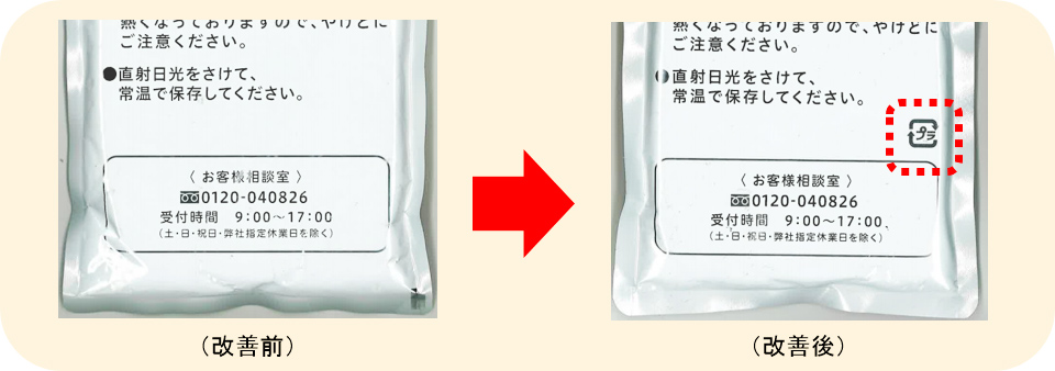 | 改善内容 | 金のどんぶりシリーズのレトルトパウチにはリサイクルマークの記載がなかったため、お客様からレトルトパウチの材質について、お問合せをいただいていました。 そこで、レトルトパウチにリサイクルマークを記載致しました。 |