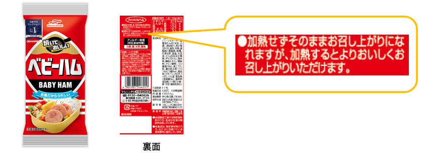 | 改善内容 | フィッシュハム・ハンバーグ類はそのままでもお召し上がりいただける商品の為、「加熱せずそのままお召し上がりになれますが、加熱するとよりおいしくお召し上がりいただけます。」とわかりやすく表示しました。 |