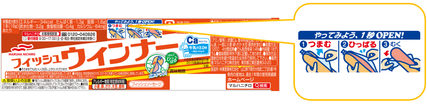 | 改善内容 | フィルムに一目見ただけでわかりやすい開け方のイラストを追加しました。 また、フィッシュウインナーの開け方動画をHPに公開いたしました。 |