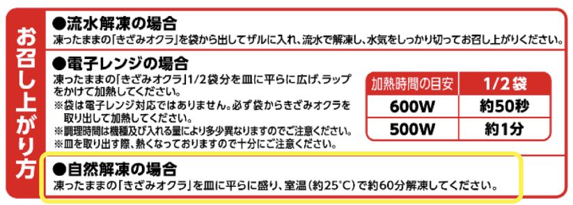 | 改善内容 | お召し上がり方に「自然解凍の場合」を追記しました。 |