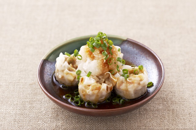 温めたしゅうまいにたっぷりと白髪ねぎをのせ、ラー油としょうゆをお好みの分量かけます。