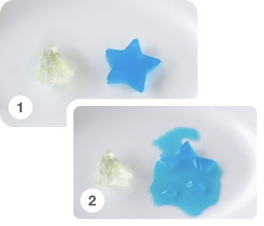 型抜きゼリーと琥珀糖について、10gずつをそれぞれ電子レンジ(500W)で加熱したところ、型抜きゼリーは5秒で溶け始めました。琥珀糖は10秒加熱しても形が変わりません。