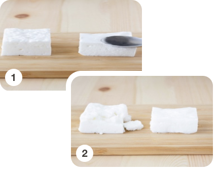 一方、ゼラチン(「ゼライス」)で固めたものは弾力があるため、スプーンで押しても押し返す力が働き、元の形に戻ります。